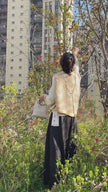 The fabric features an intricate phoenix feather jacquard pattern woven directly into the textile. In Chinese culture, phoenix symbolism represents prosperity, renewal, harmony, and feminine strength, making phoenix motifs one of the most meaningful elements in traditional Chinese clothing. The golden jacquard texture reflects light with a subtle sheen, creating an elegant look that feels both sophisticated and timeless.