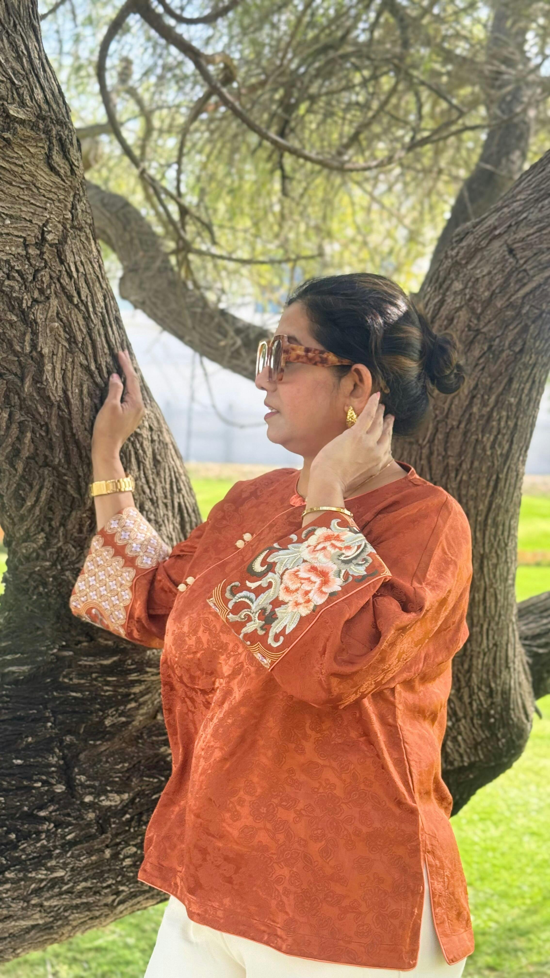 Bring a touch of tradition and sophistication to your wardrobe with the Vintage Red Xiangyunsha Embroidered Blouse from Luxe Orienta. Crafted from authentic Xiangyunsha silk, a rare hand-dyed fabric prized for its soft texture, natural sheen, and breathability, this blouse features delicate embroidery that reflects the artistry of Chinese craftsmanship. The vintage red hue exudes warmth and elegance, making it suitable for daily wear, cultural events, or special occasions.