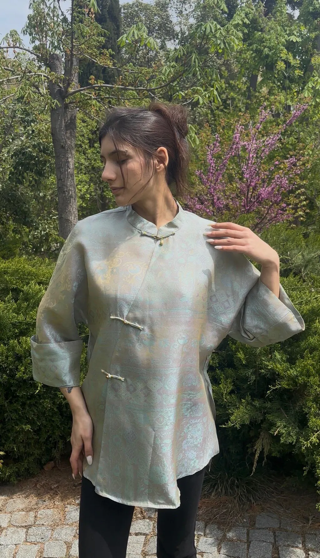 这款优雅的中式丝绸衬衫专为欣赏东方风格时尚、文化传承与低调奢华的女性设计。